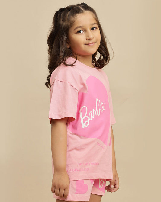 -30% OFF New ArrivalBarbie printed Relaxed Fit T-Shirt & Shorts Co-Ords Set For Girls