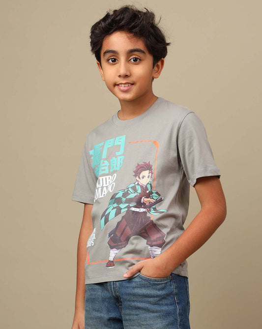 -15% OFF New ArrivalDemon Slayer: Tanjiro Anime Printed Grey Regular Fit Pure Cotton Tshirt For Boys