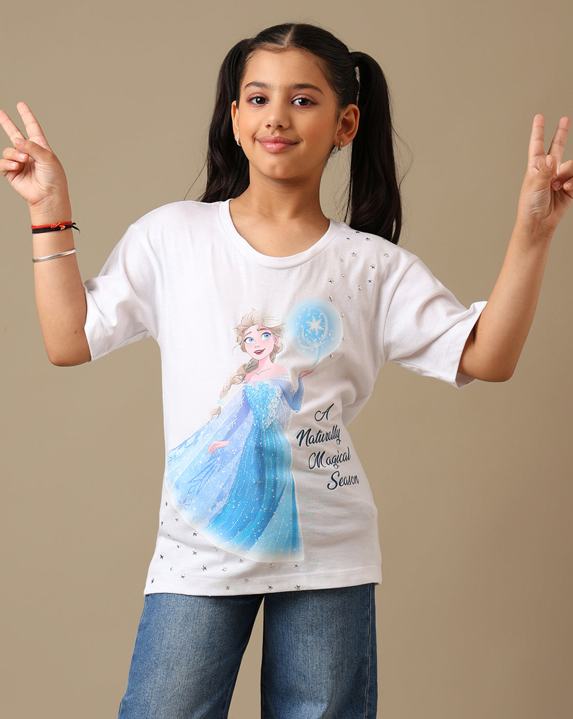 This Frozen oversized T-shirt combines relaxed style with movie magic. Made from lightweight cotton fabric, it keeps her cool and comfy while showing off her favorite characters. The oversized fit gives it a trendy streetwear touch, perfect for pairing with jeans, skirts, or leggings. A fun and fashionable pick for young Frozen fans.