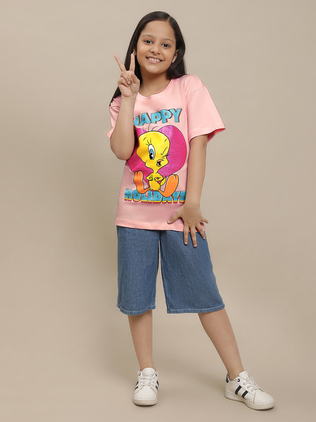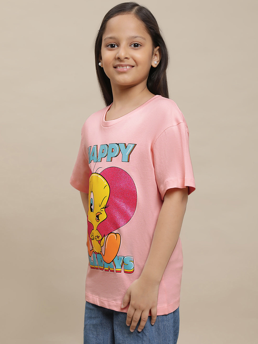 Hey parents, are you tired of your little girl wearing the same boring t-shirts? Well, we've got just the thing to spice up her wardrobe - the Kidsville Looney Tunes Printed Pink Tshirt For Girls! Made with high quality material and professionally printed, this t-shirt will keep your little one comfortable and stylish all summer long. And for all you LOONEY TUNES fans out there, this t-shirt features a printed character on the front that will make your kid the coolest one on the block. Plus, it's an officially licensed product, so you know it's the real deal. Don't wait, get your hands on this trendy t-shirt from Kidsville now!